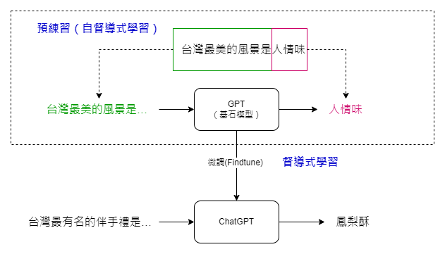 我們提到過,預訓練的模型可以被視為一種“基石模型”。為了讓這個模型更能符合我們的需求,我們會在其基礎上進行微調。通過微調,當模型遇到類似的問題,比如“台灣最有名的伴手禮是什麼?”時,它將更有可能給出我們期望的答案,比如“鳳梨酥”。