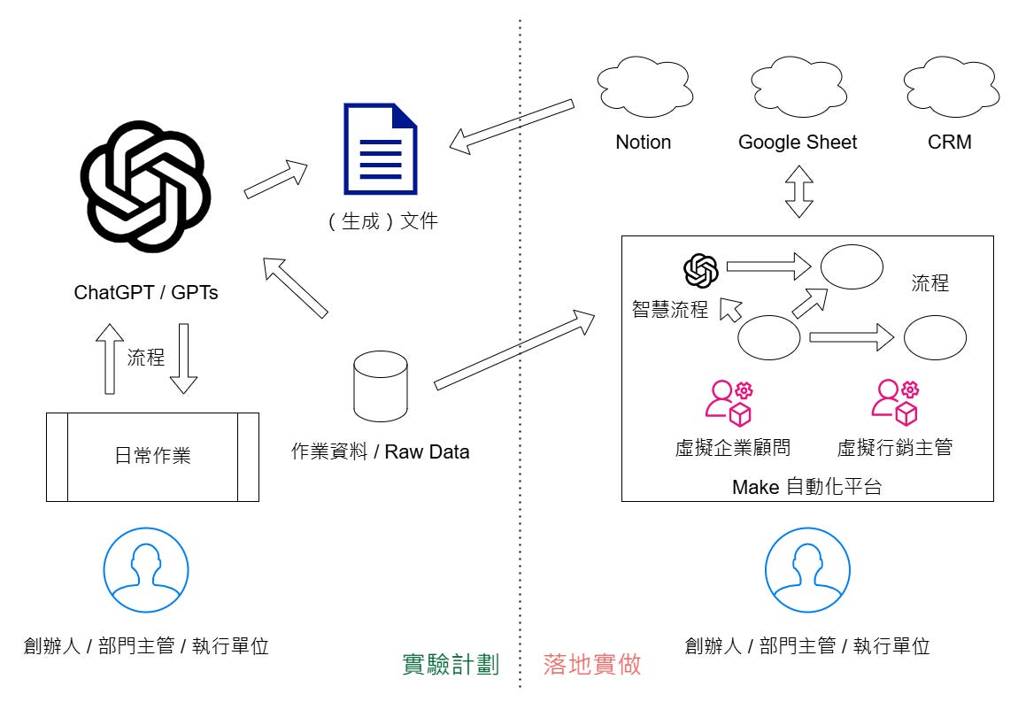 若實驗證實投入值得,我們將把此模式與 Make 自動化平台進行深度整合。屆時,我們的智慧助理不只是一個「撰稿工具」,而將演化為真正的智慧流程「中樞」。想像一下: