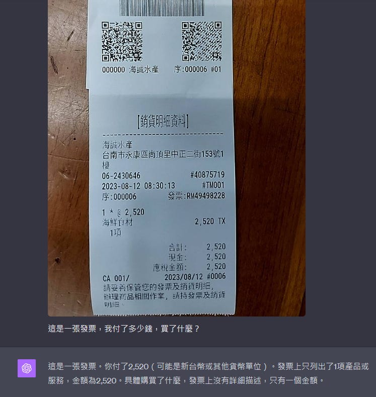 在發票資訊辨認的實驗中,GPT-4V 無法正確識別我們的購買品項。這可能是因為 GPT-4V 不能確定哪些資料是購買品項。但後續的實驗更加確認了它在中文支援上的局限性。