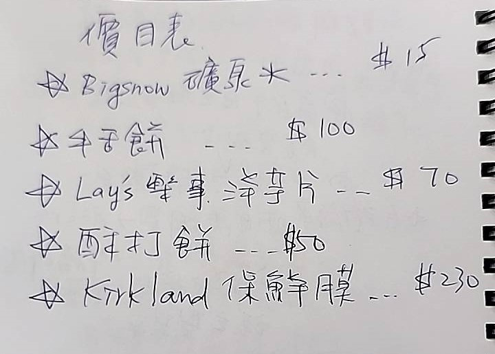 接著,我們提供了價目表和購買品項照片的實驗。以下是價目表: