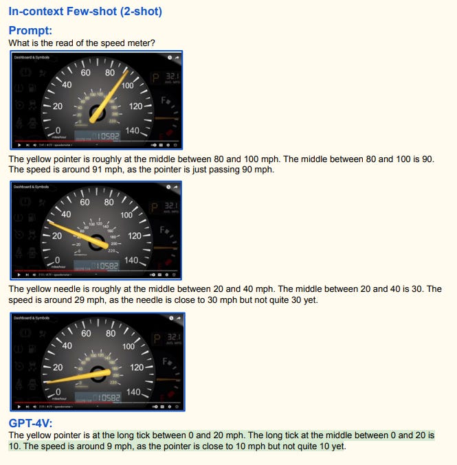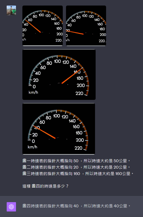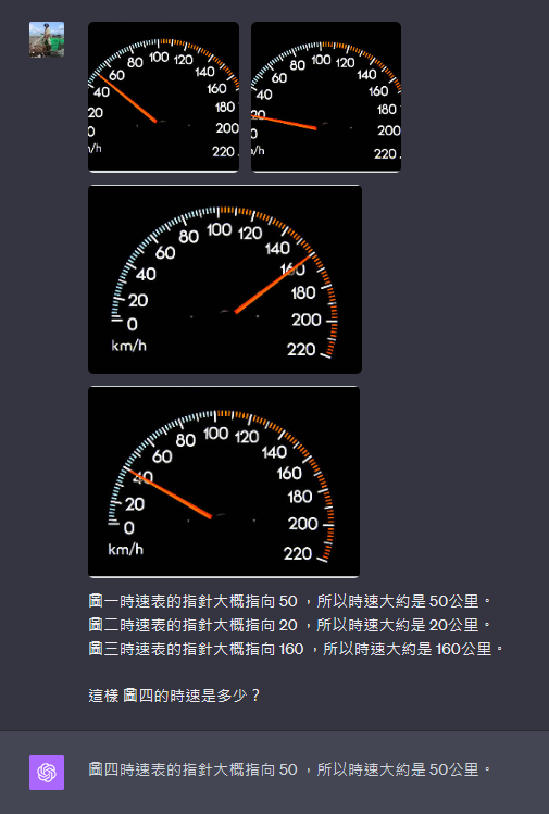 最後一點,可能與 ChatGPT 的設計有關。在微軟的 GPT-4V 報告中,詳細介紹了當圖片理解或回覆能力不足時,可以透過上下文少樣本學習(in-context few shots learning)來優化回覆。但當我們針對時速表讀取進行實際測試,ChatGPT 有時正確,有時則錯誤,這不穩定的表現使我們質疑:它是否真的通過少樣本學習來真正理解我們的問題並作出正確回覆?還是只是隨機猜測?