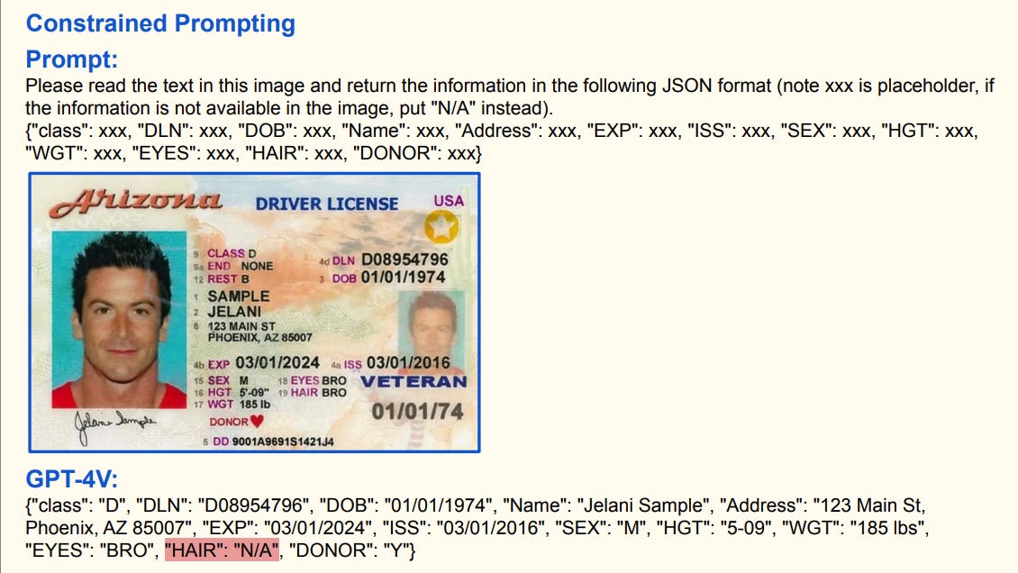 請閱讀此圖像中的文字,並將訊息以下方的JSON格式返回(注意xxx是佔位符號,如果圖像中沒有相關訊息,請填入"N/A")。 {"class": xxx, "DLN": xxx, "DOB": xxx, "Name": xxx, "Address": xxx, "EXP": xxx, "ISS": xxx, "SEX": xxx, "HGT": xxx, "WGT": xxx, "EYES": xxx, "HAIR": xxx, "DONOR": xxx} --- GPV-4V 的回覆 --- {"class": "D", "DLN": "D08954796", "DOB": "01/01/1974", "Name": "Jelani Sample", "Address": "123 Main St, Phoenix, AZ 85007", "EXP": "03/01/2024", "ISS": "03/01/2016", "SEX": "M", "HGT": "5-09", "WGT": "185 lbs", "EYES": "BRO", "HAIR": "N/A", "DONOR": "Y"}少樣本學習