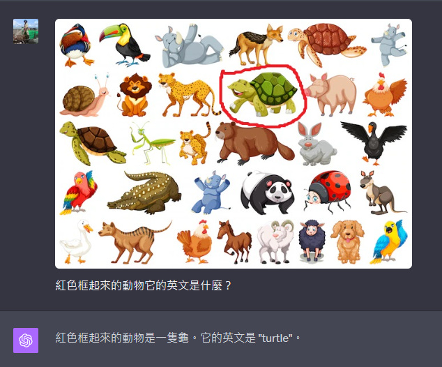 GPT-4V 不僅能夠理解圖片,其對圖片內指示符號的解讀也同樣令人印象深刻。例如,以下圖中框選烏龜後所進行的詢問。